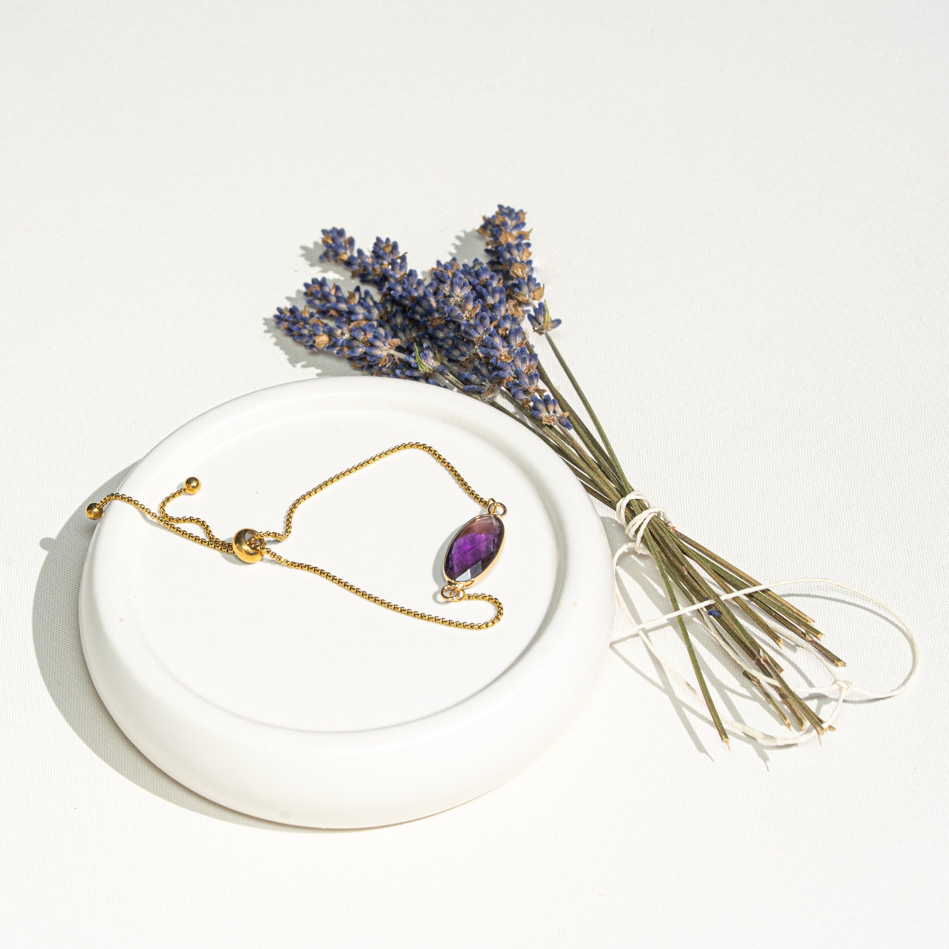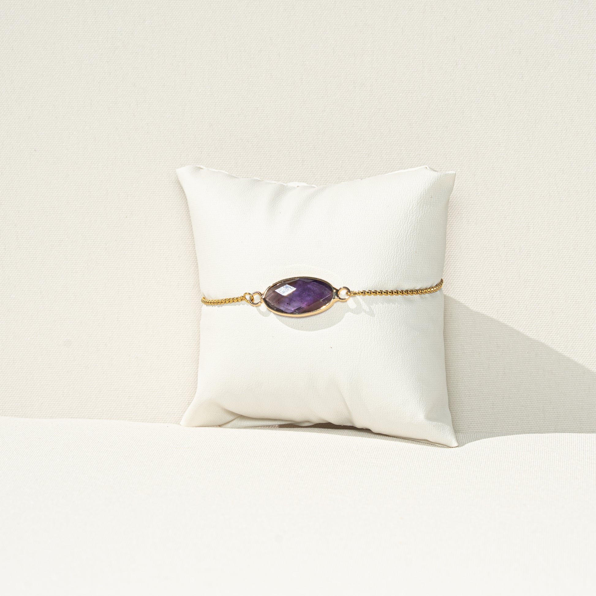 Edelsteinarmband aus hypoallergenem, wasserfestem Edelstahl mit facettiertem Amethyst eingefasst mit vergoldeten Kanten in schöner Schmuckbox.
