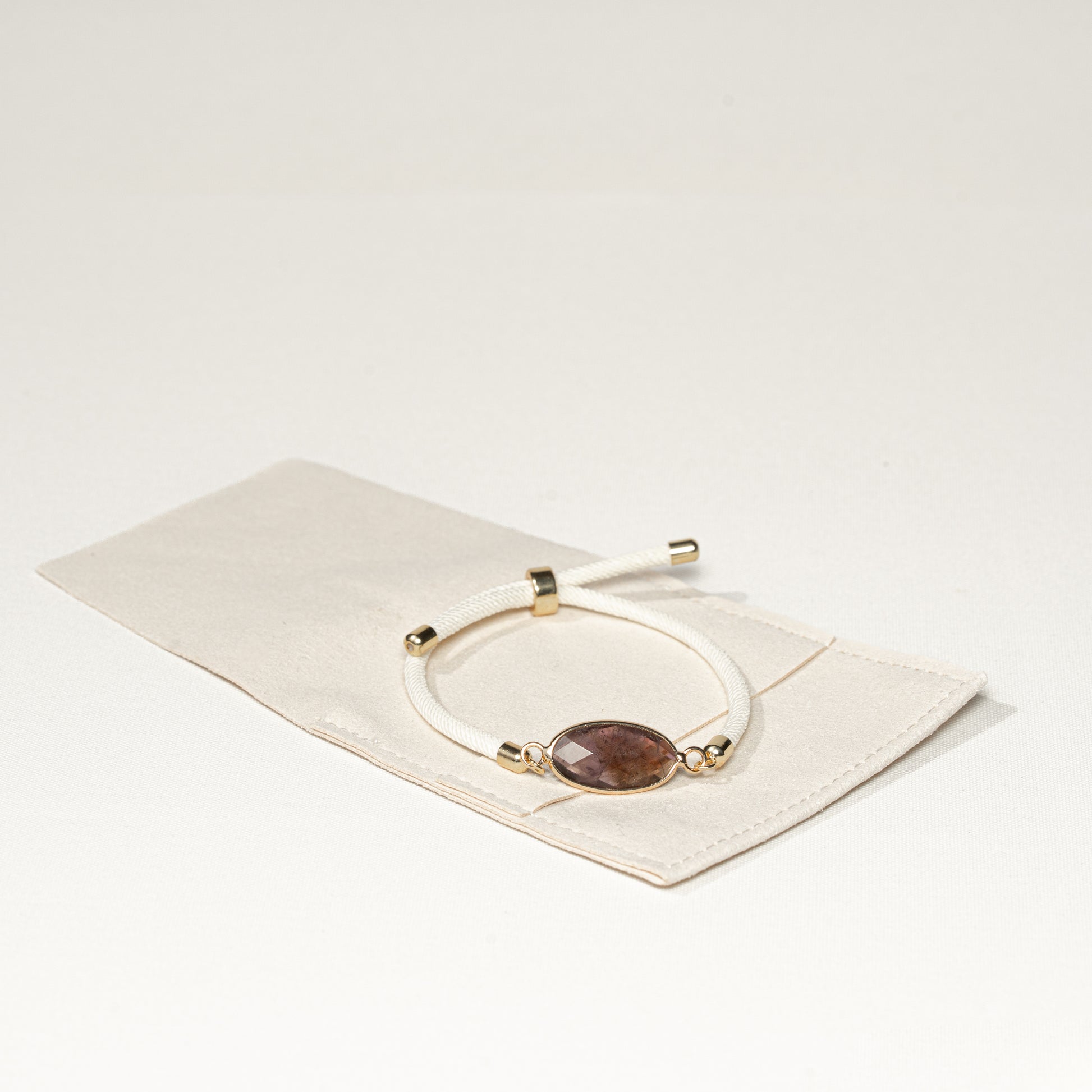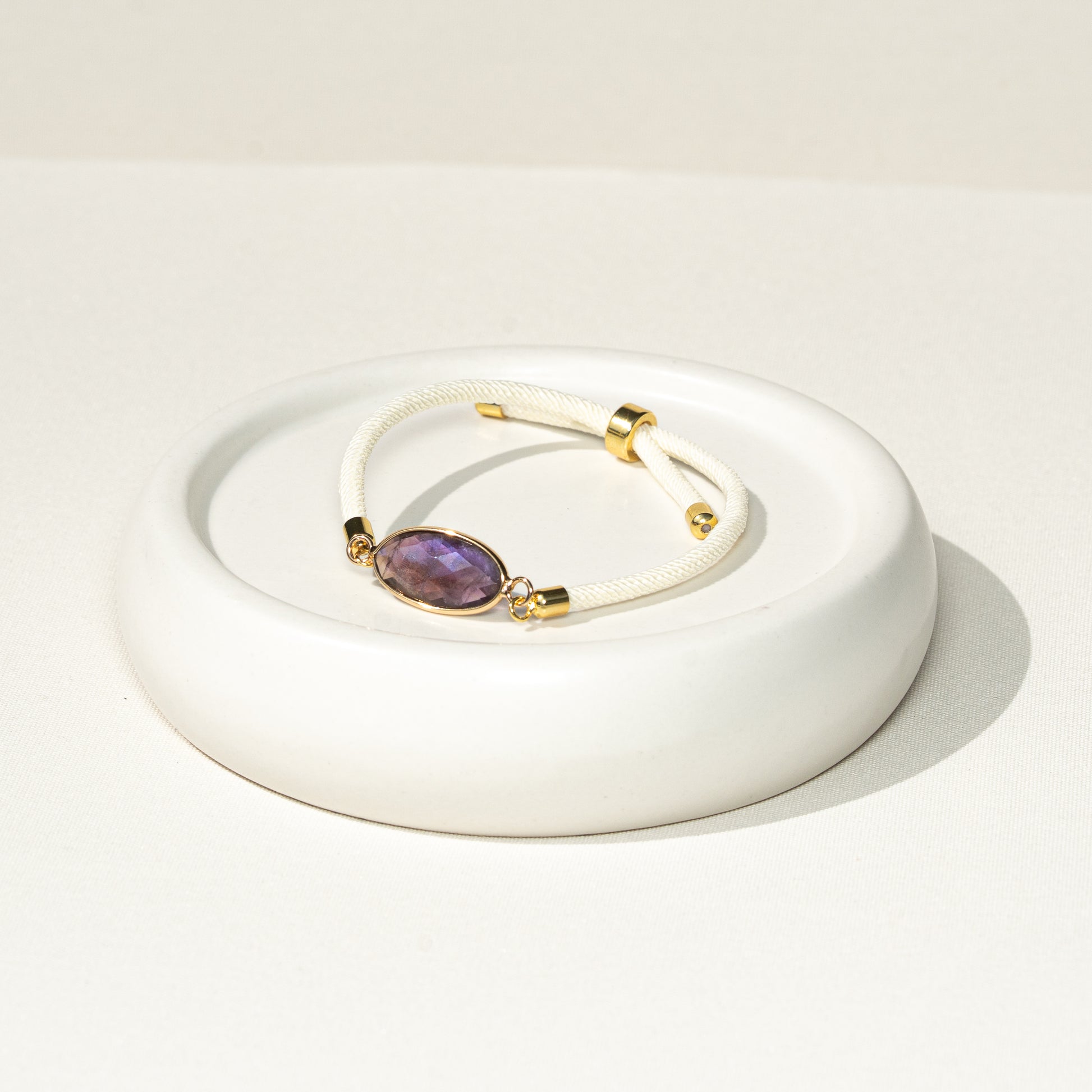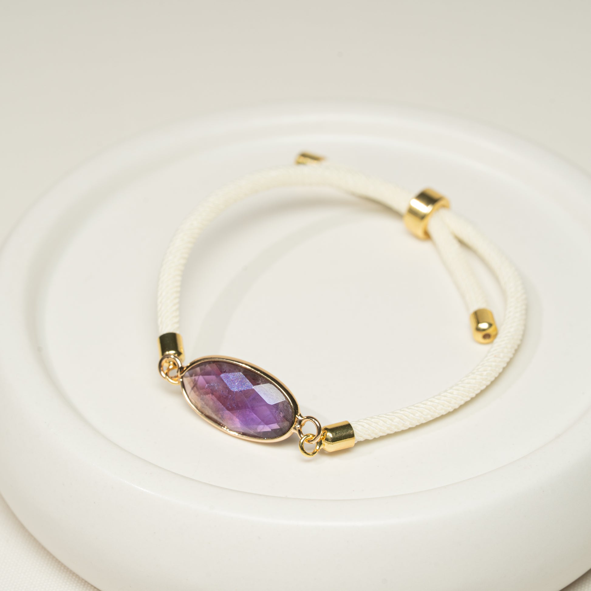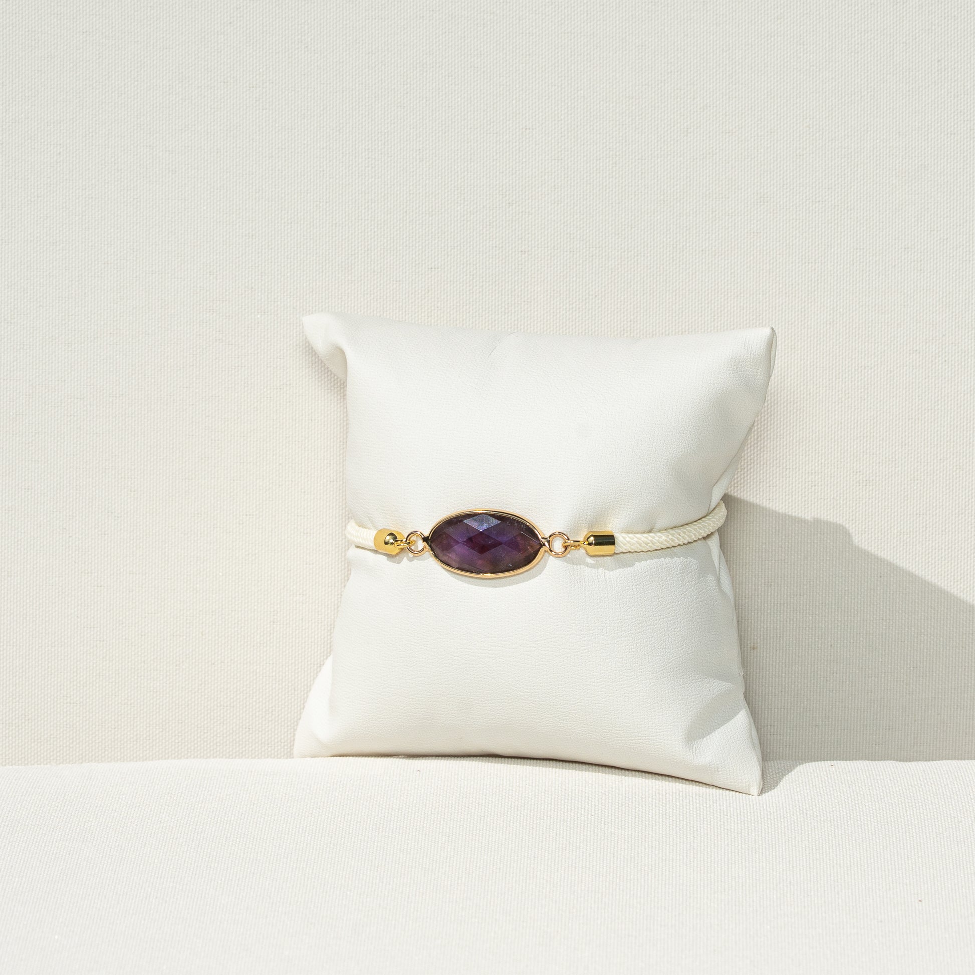 Kunstfaserarmband mit facettiertem Amethyst eingefasst mit vergoldeten Kanten in schöner Schmuckbox.
