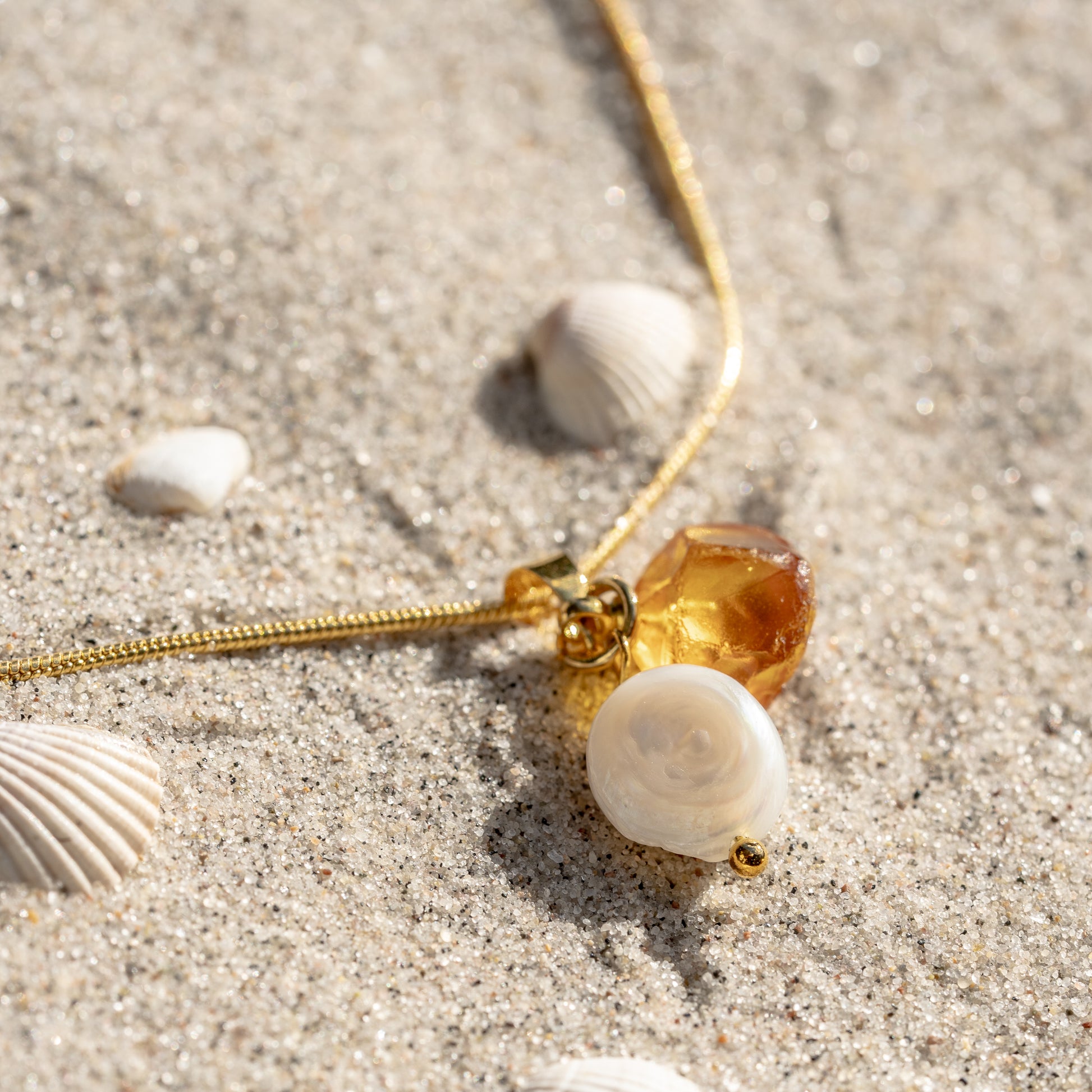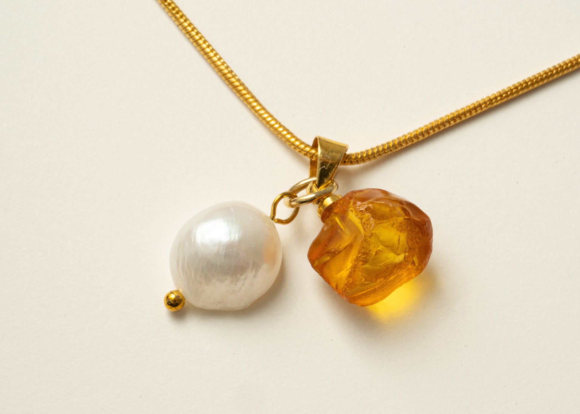 Diese elegante Kette vereint zwei wunderbare Naturmaterialien: den warmen, goldenen Schimmer von Bernstein und die zarte Eleganz einer Süßwasserperle. Der Doppelanhänger schafft eine harmonische Verbindung zwischen den beiden edlen Materialien und verleiht der Kette eine raffinierte, gleichzeitig natürliche Ausstrahlung. Ideal für besondere Anlässe oder als stilvolles Accessoire für den Alltag – diese Kette ist ein wahres Highlight für Liebhaber von einzigartigem Schmuck.