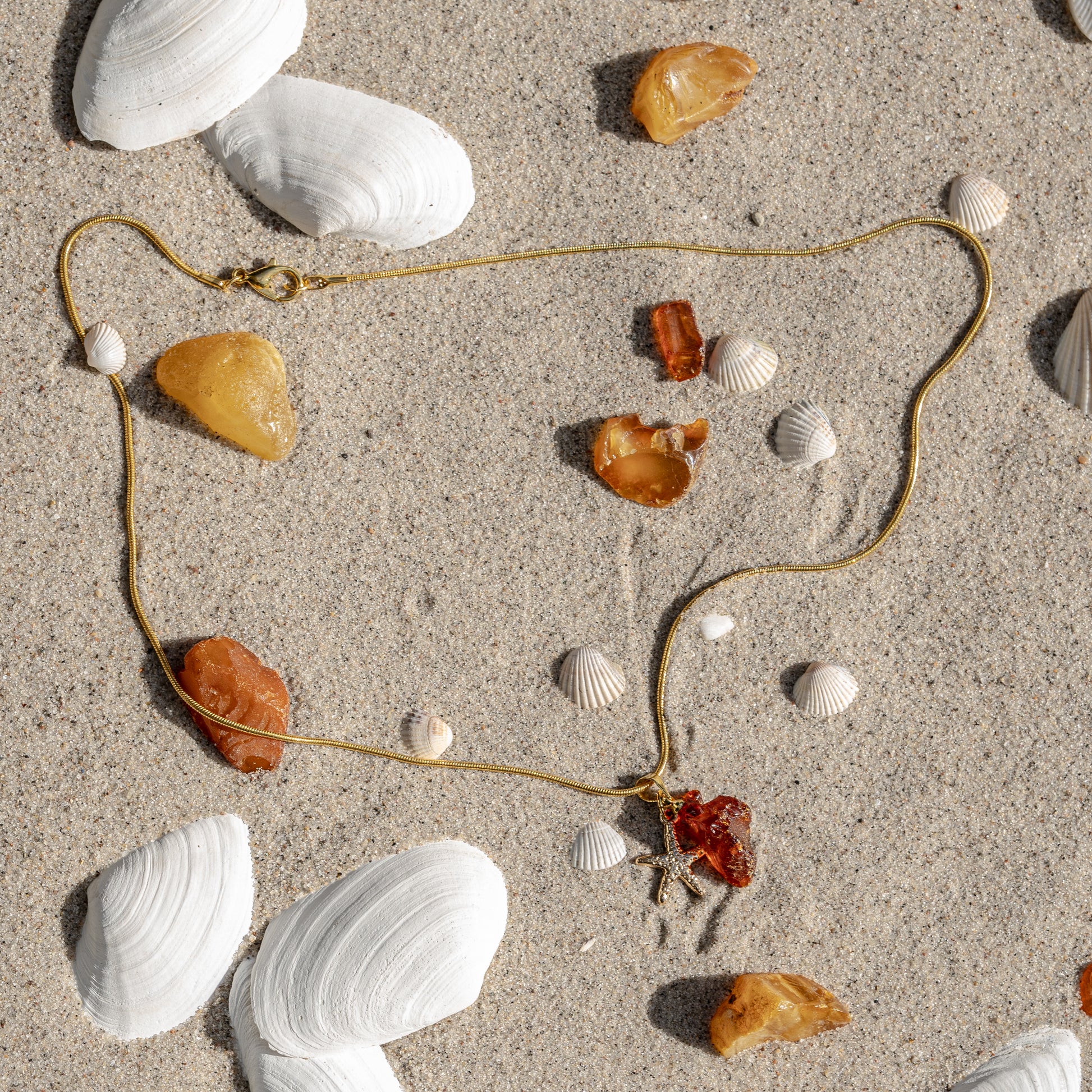 Diese bezaubernde Bernsteinkette kombiniert die warme Schönheit des Bernsteins mit einem goldfarbenen Seestern-Anhänger, der das maritime Flair unterstreicht. Der goldene Seestern verleiht der Kette eine elegante und gleichzeitig verspielte Note, die perfekt zu einem Sommeroutfit oder für festliche Anlässe passt. Die Kette strahlt eine subtile, aber raffinierte Eleganz aus und ist das ideale Schmuckstück für alle, die das Meer und die Natur lieben.