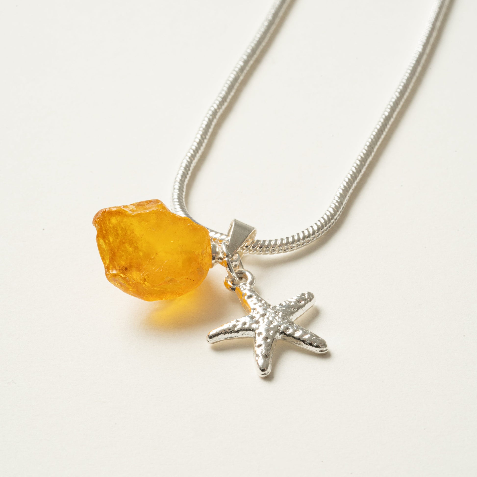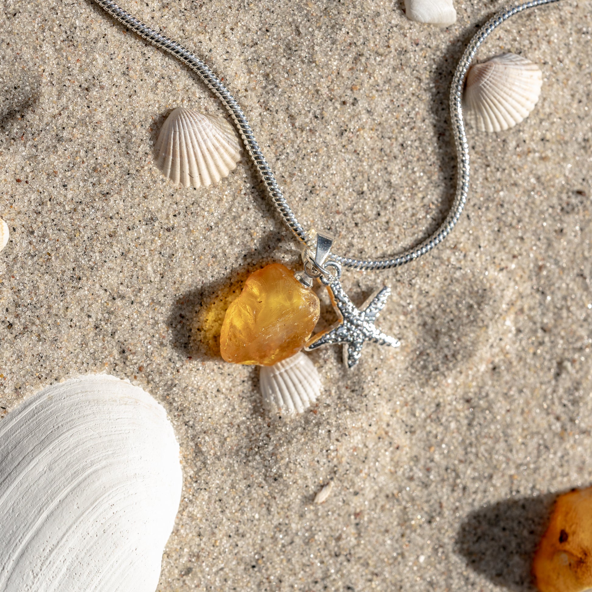 Diese bezaubernde Bernsteinkette kombiniert die warme Schönheit des Bernsteins mit einem silberfarbenen Seestern-Anhänger, der das maritime Flair unterstreicht. Der silberne Seestern verleiht der Kette eine elegante und gleichzeitig verspielte Note, die perfekt zu einem Sommeroutfit oder für festliche Anlässe passt. Die Kette strahlt eine subtile, aber raffinierte Eleganz aus und ist das ideale Schmuckstück für alle, die das Meer und die Natur lieben.