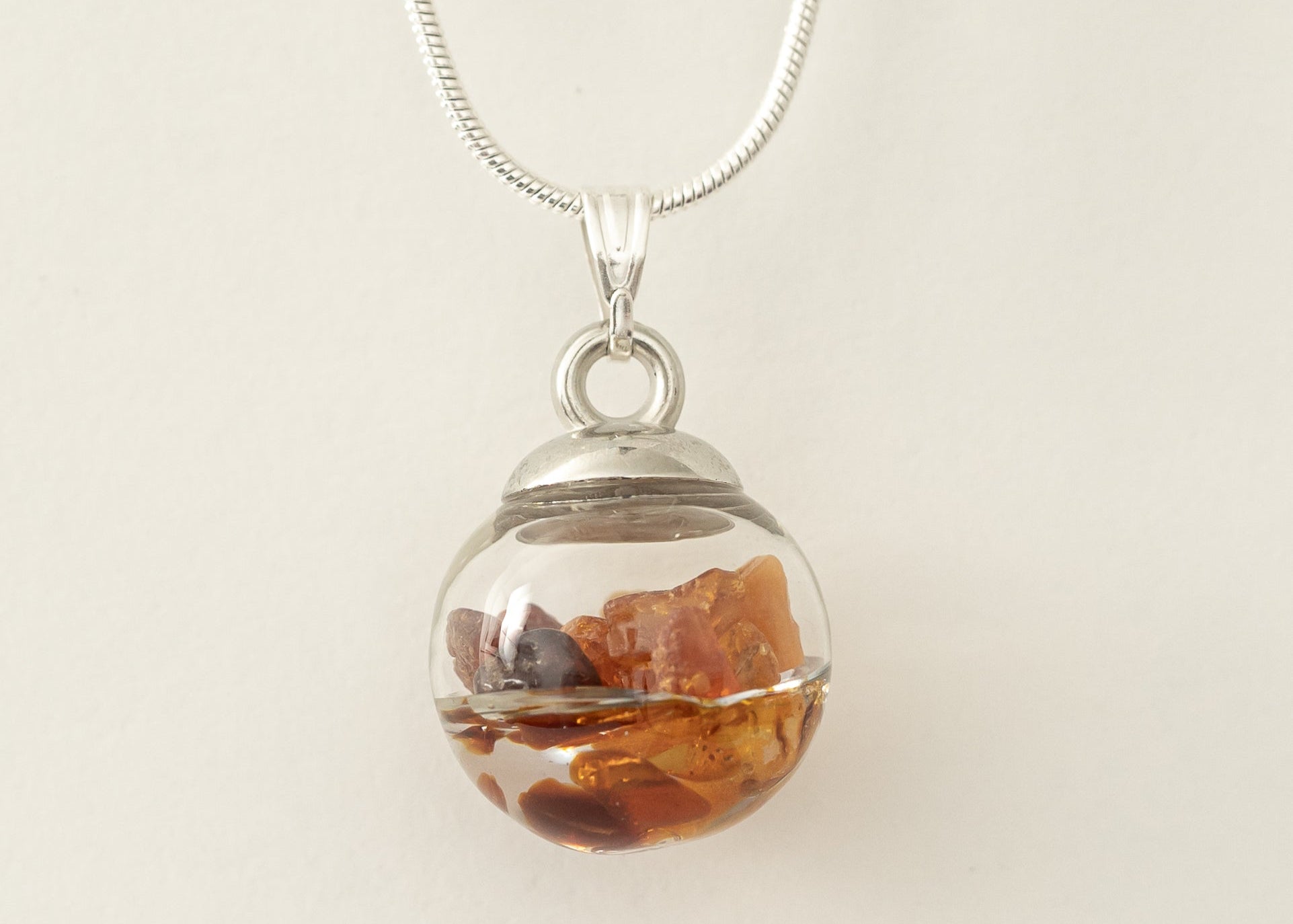 Die handgefertigte Perle aus Glas mit echtem Bernstein vereint warme Erdenergie mit strahlender Leichtigkeit. Der goldene Bernstein schenkt Lebensfreude, Vitalität und Schutz, indem er negative Energien in positive Schwingungen verwandelt. Er stärkt das Solarplexus-Chakra, fördert Selbstbewusstsein, Kreativität und innere Balance, während seine sanfte Wärme Geborgenheit und Trost ausstrahlt. So wird die Glasperle zu einem kraftvollen Talisman voller Lebensenergie – ideal als Anhänger, Armband oder persönlicher Glücksbringer für mehr Kraft und Freude im Alltag.