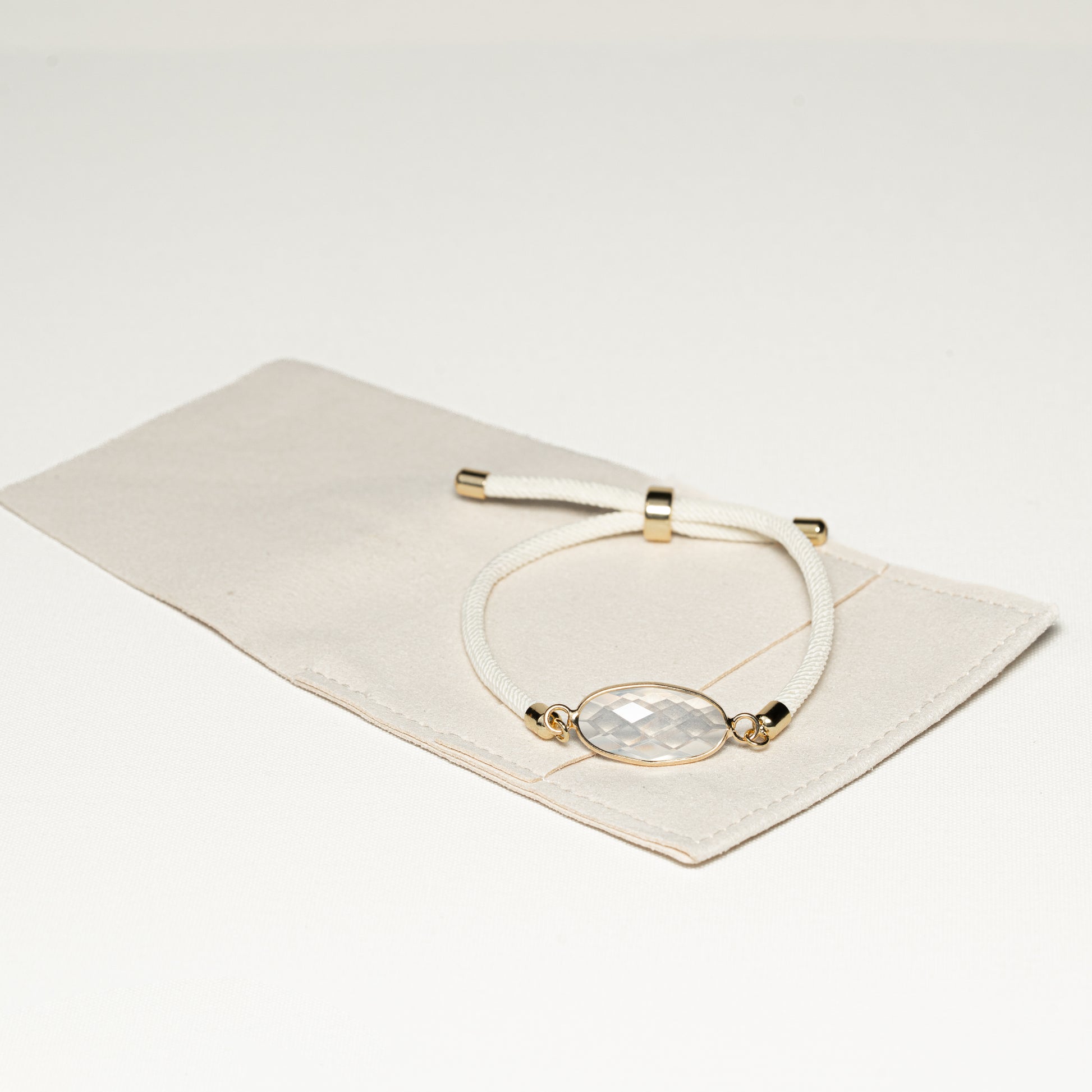 Kunstfaserarmband mit facettiertem Opal eingefasst mit vergoldeten Kanten in schöner Schmuckbox.