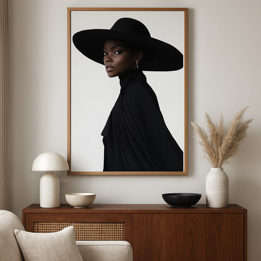 Die reduzierte Darstellung einer Frau in schwarzem Outfit und Hut fängt einen Moment purer Stilsicherheit und rätselhafter Aura ein – ein echtes Statement-Piece für Büro, Wohnzimmer oder Arbeitszimmer. Der starke Hell-Dunkel-Kontrast, die klaren Linien und der ikonische Hut verleihen jedem Raum eine edle, kunstvolle Atmosphäre.