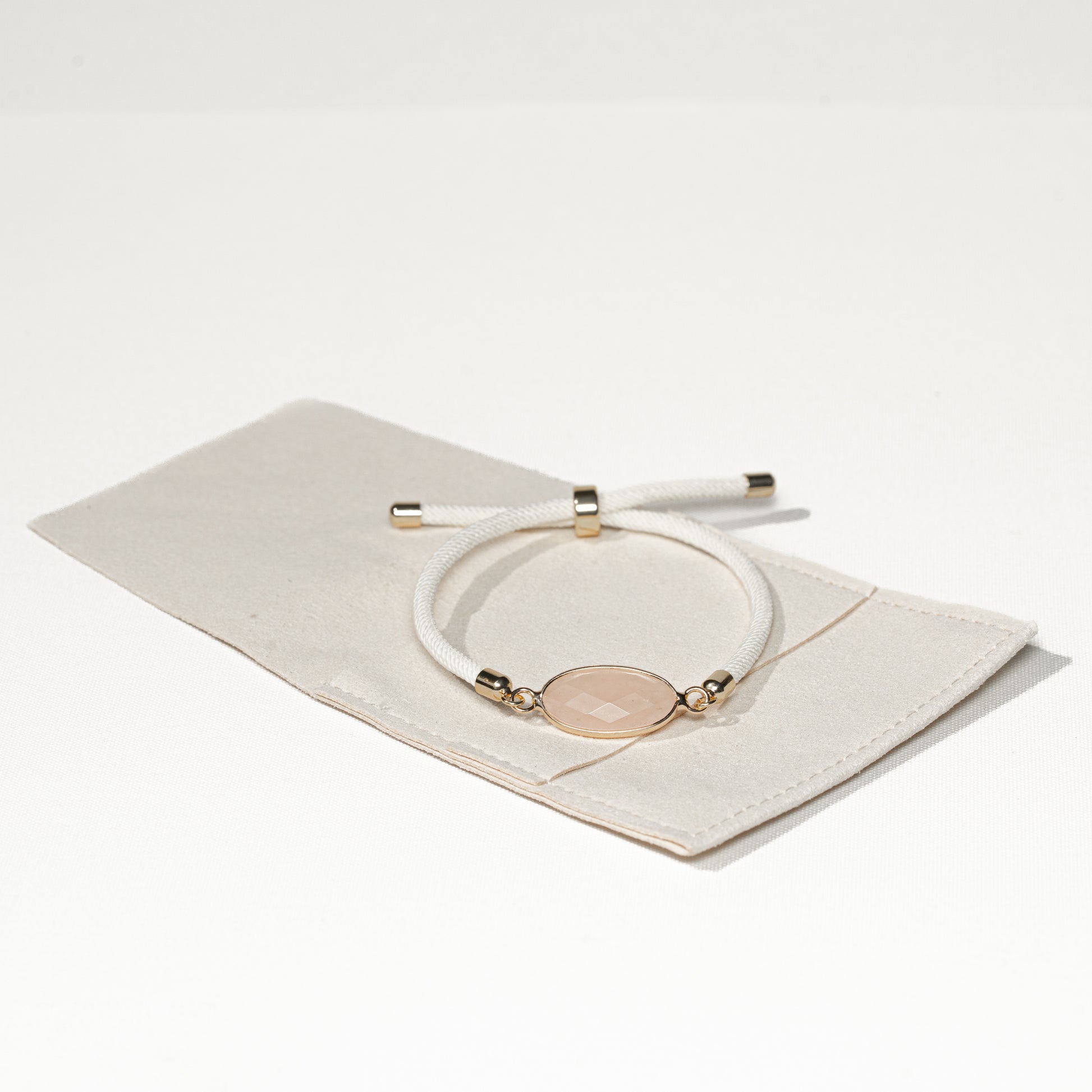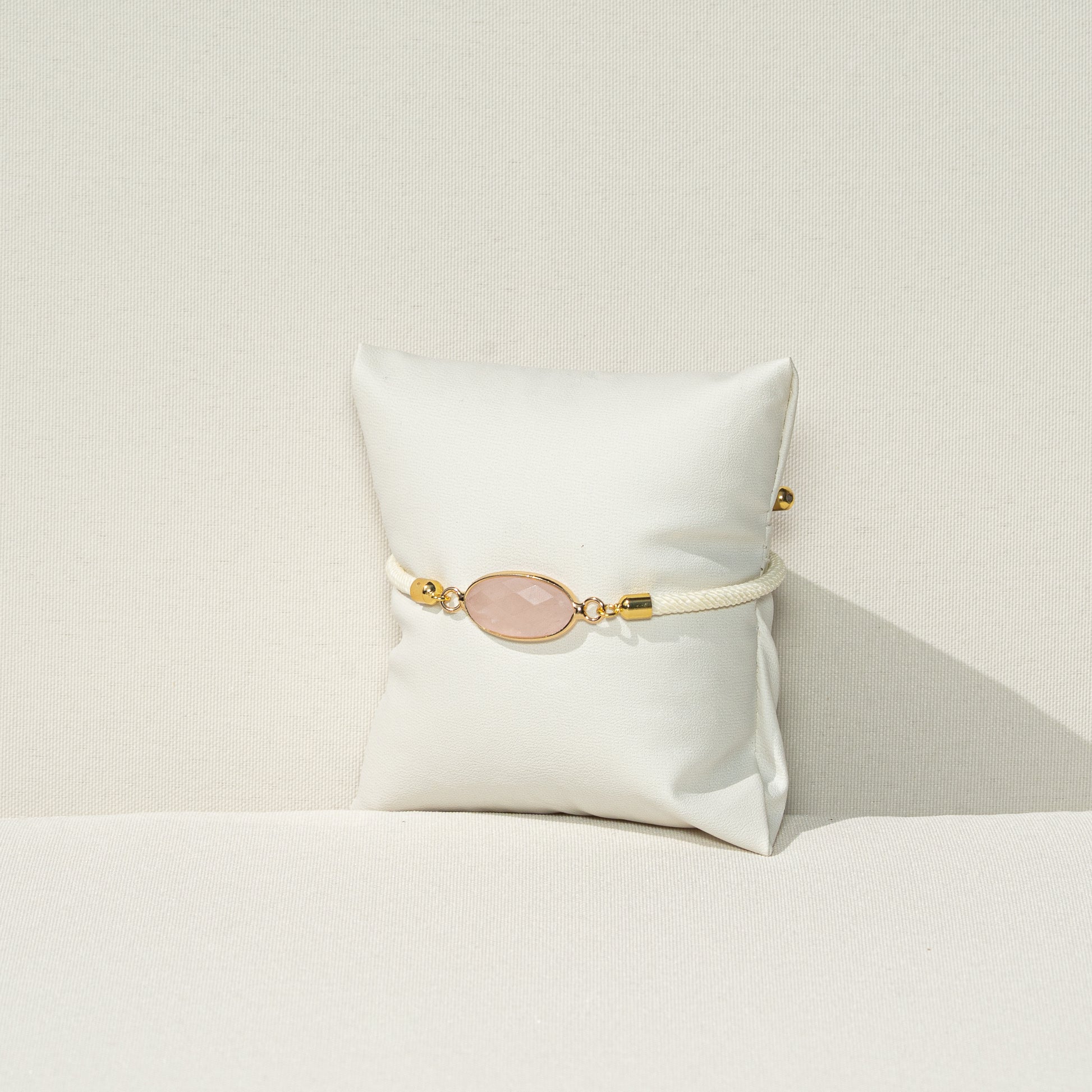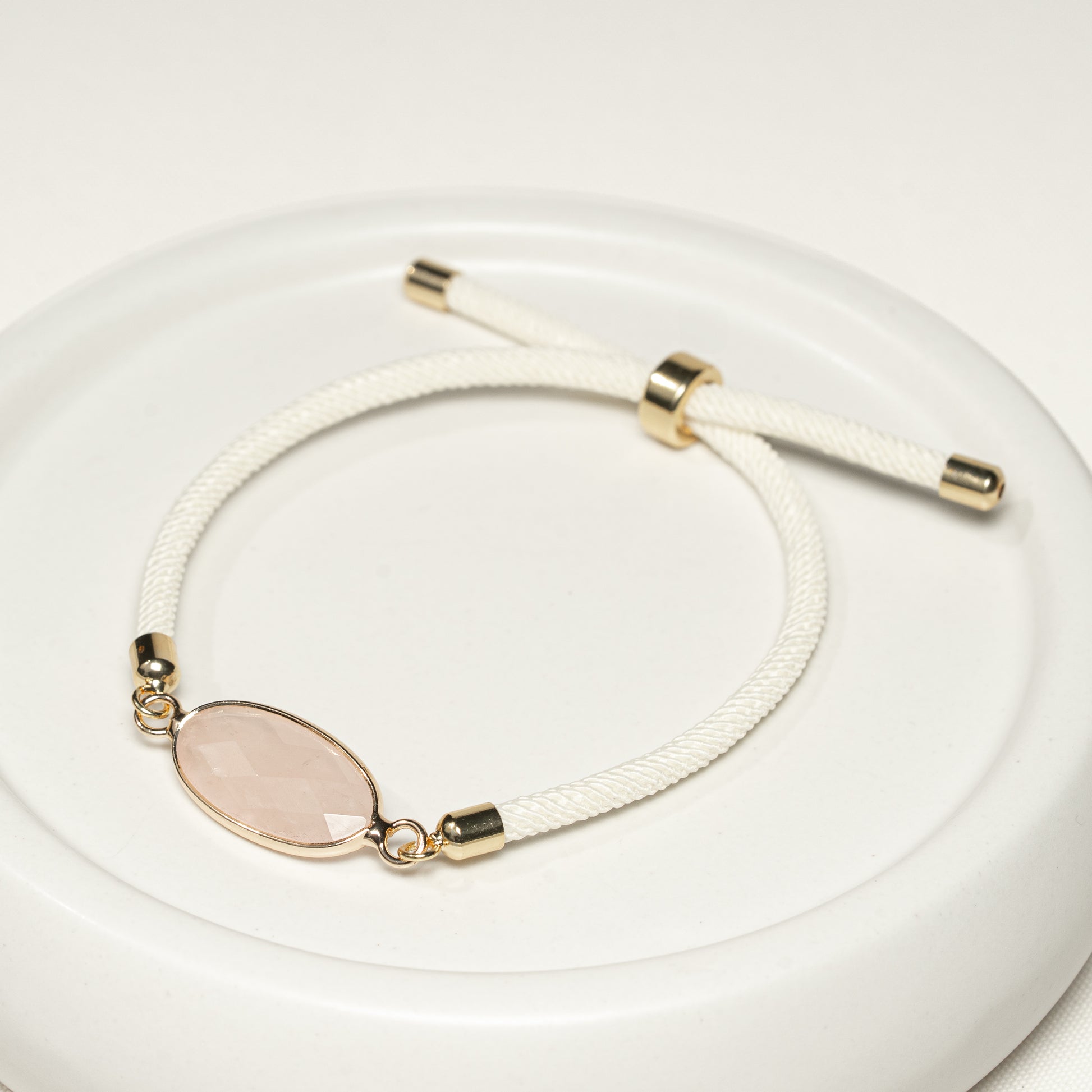 Kunstfaserarmband mit facettiertem Rosenquarz eingefasst mit vergoldeten Kanten in schöner Schmuckbox.