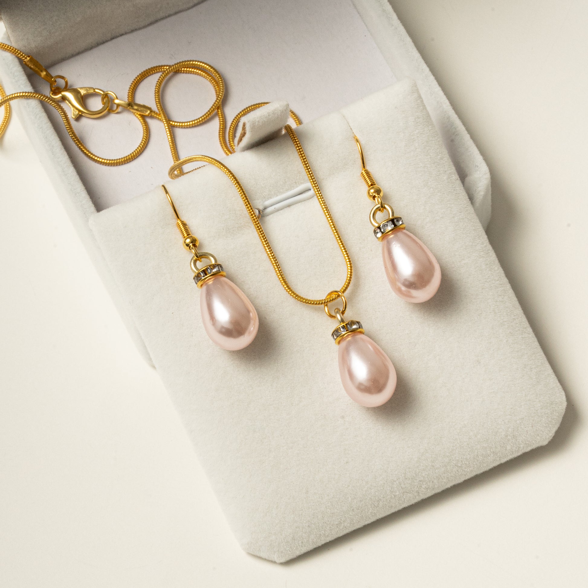 Dieses stilvolle Set vereint feminine Leichtigkeit mit feinem Glanz. Die Hängeohrringe mit zartrosa Perlen und kleinen Strasssteinchen schwingen sanft bei jeder Bewegung und harmonieren perfekt mit der filigranen Kette, die einen passenden Anhänger trägt. Der sanfte Roséton in Kombination mit dem dezenten Funkeln macht dieses Set ideal für romantische Outfits, besondere Anlässe oder als liebevolles Geschenk.